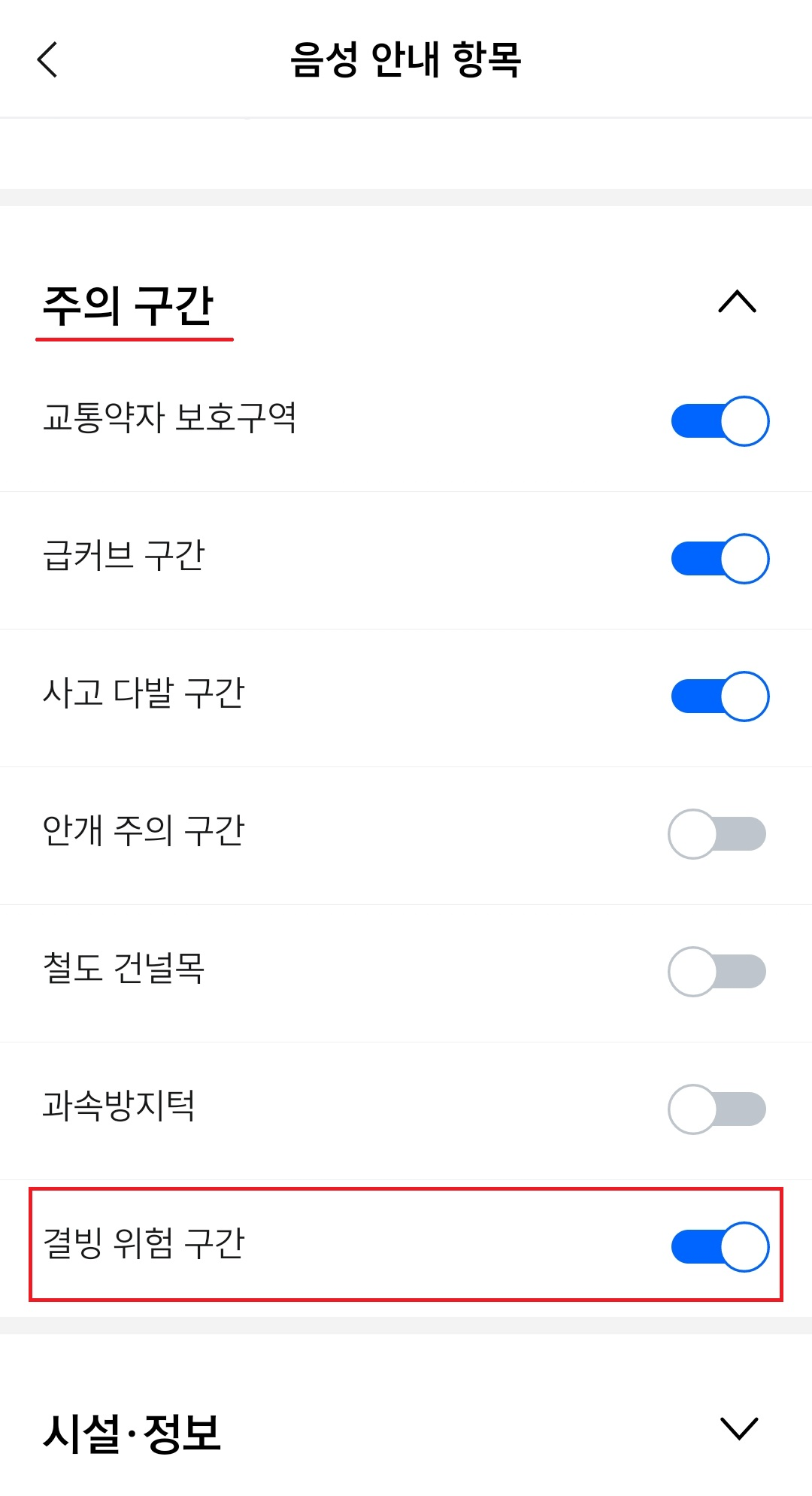 여기서 '결빙 위험 구간' 설정을 활성화시키면 끝!