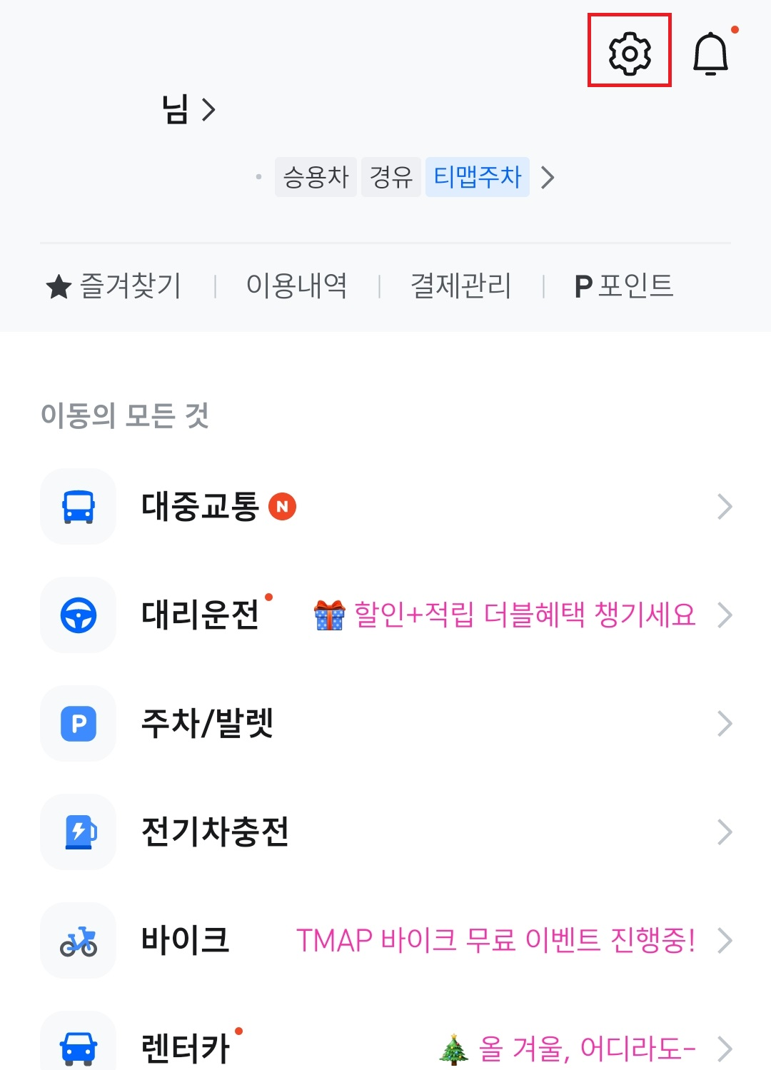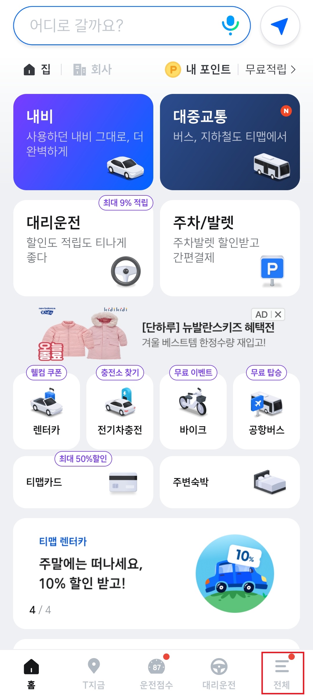 티맵을 실행한 후 하단 오른쪽의 전체 탭을 누릅니다.