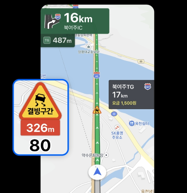 결빙 위험 구간 설정을 해두게 되면 결빙 예상 구간 300m 전에 음성과 이미지로 안내가 나오는데요.