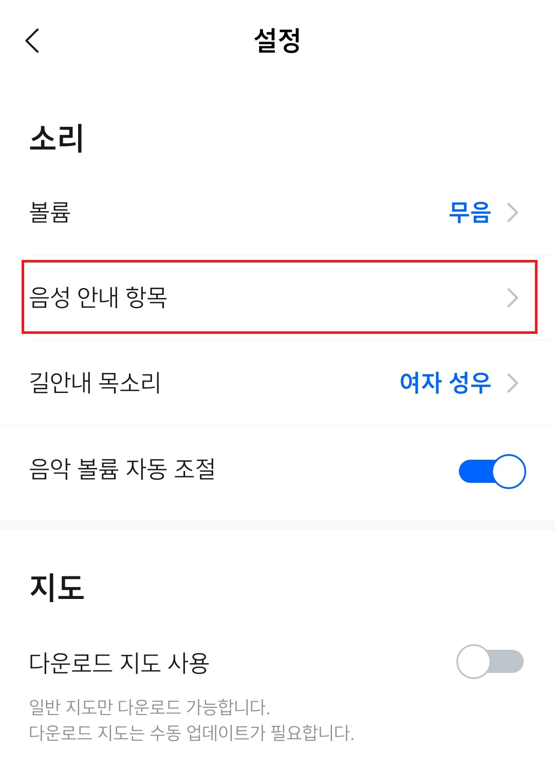 우측 상단의 톱니바퀴를 누르면 설정이 나오는데요. 음성 안내 항목을 선택합니다.